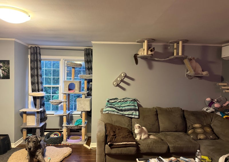Cats do not require a big space to live in. They do well in big homes as well as a bachelor pad. They do need things to climb on to get away when they chose to. We have a couple cat trees and a climbing wall as well which saves space. Climbing wall is our cats Favorite thing. They love it.
